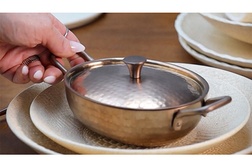 Изготовленная из высококачественной нержавеющей стали 18/10, сковорода отличается долговечностью, устойчивостью к коррозии и безопасностью для пищевых продуктов. Матовое бронзовое покрытие органично впишется в индустриальные стили, такие как лофт или гранж, придаст интерьеру уют и поддержит эко-эстетику. Этот вариант сковороды идеален для индивидуальной подачи горячих блюд, таких как овощное рагу с мясом или омлет; холодных и горячих закусок, а также гарниров к главному блюду. Подавайте в ней оливки, пряную брынзу, пеперони, мини-моцареллу, а также муссы из сыра, авокадо или рыбы. Для горячих блюд рекомендуем использовать подстановочную тарелку или деревянную доску овальной или прямоугольной формы, чтобы сохранить гаpмонию форм.