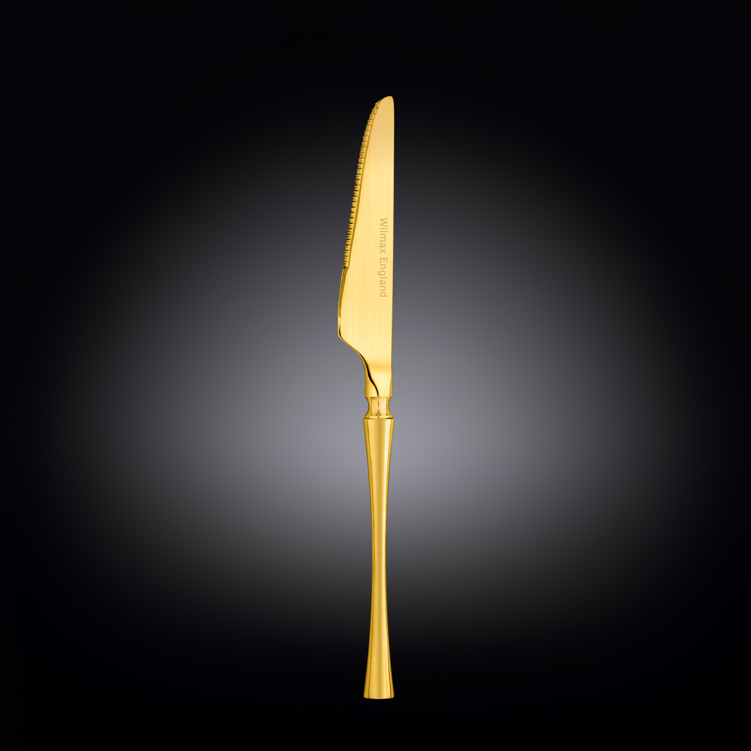 Нож для стейка 22,5 см на блистере WL-999.503.505/1B из коллекции Diva от бренда WILMAX — оснащенный длинным лезвием с острыми зубчиками, позволяет осуществлять нарезку мяса, обеспечивая сохранность сочности стейка. Вдохновленный винтажным шармом, этот нож станет незаменимым дополнением к вашему столовому набору. Изделие доступно в четырех расцветках: классическом стальном, бронзовом, золотом и черном цветах, что позволяет подобрать лучшее решение для любого интерьера и стиля сервировки.